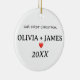 CUSTOMIZE this simple ornament to adorn your holiday decor commemorating your blessed union: Our First Christmas, Couple's Names, Red Heart, Year. You can change the text/font style/colours. #newlyweds