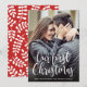 This Christmas holiday photo card features the phrase "our first Christmas" in a modern handwritten script. Your photo is displayed behind. The back is a white and red (or you can change the colour) holiday leaf pattern.