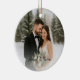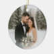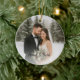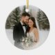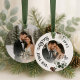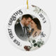 Celebrate the joy of newlywed life with this personalised "Our First Christmas as Mr. & Mrs." wedding photo ornament. Crafted in a classic round ceramic design, this keepsake features elegant script lettering, festive greenery, pinecones, and delicate winter florals. One side showcases a custom wedding photo with the text “Our First Christmas as Mr. & Mrs.”, while the reverse side offers space for a second photo and the couple’s names, making it a truly one-of-a-kind wedding gift, or Christmas tree decoration. Perfect for commemorating your first holiday season together, this romantic holiday ornament becomes a cherished keepsake year after year.