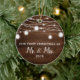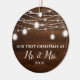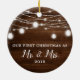 Our First Christmas Mr. and Mrs. Holiday Custom Ceramic Ornament. This design features a rustic wood background with mason jar string lights.