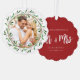 Celebrate your first Christmas as Mr and Mrs with this pretty ornament card. The simple design feature a photo of the couple surrounded by a simple watercolor wreath of Christmas greenery and berries. The reverse side is coordinated in red. Personalise with your married name and the year.