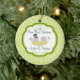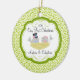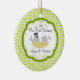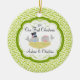 Our unique dated custom Our First Christmas Ornament features a cute bride & groom bird couple sitting in a birds nest set on a green & white floral swirl background! Personalise with your information and date and you're all set to go! Wonderful dated keepsake gift for a couples first christmas and a great addition to you christmas ornament collection.