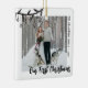 Celebrate the season with this square Christmas ornament featuring “Our First Christmas” on the front for a sweet and memorable touch. The design highlights a large photo accented with a black doodle swag of pine greenery and hanging ornaments in the top left corner, slightly overlapping the image for a casual, hand-drawn look. Your names or family name and the year appear in a simple black handwritten font on the top right for a clean, modern balance.