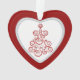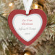 A pretty retro style red swirl Christmas tree is at the centre of this heart shaped ornament. The image is placed on a white background, and is framed with a glittery faux diamond frame. Everything is placed on a bright red background. The back of the ornament has the same red background and frame, with three custom text fields in red and grey. Very appropriate for a couple's first Christmas together, but can easily be adapted to commemorate many occasions.