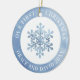 Personalised first Christmas ornaments feature decorative white snowflake on winter blue artistic watercolor background with couple's names on one side, and couple's picture and Mr. and Mrs. last name on the other side, modern and trendy.
