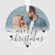 Personalised Our First Christmas Together Ornament. Celebrate your first holiday season together with this elegant, custom ornament, perfect for capturing the joy of your relationship. The front features space for a treasured photo of the two of you, adorned with the phrase "Our First Christmas Together" in beautiful script calligraphy and a serif font, along with your names and year for a personalised touch. The back offers room for a second favourite photo, adding even more warmth and meaning to your keepsake, accompanied by "Merry Christmas" in the same delicate script, with your names and year displayed smaller at the bottom. Black heart accents add a sweet, romantic touch, while a soft white ombre at the bottom of each photo creates a smooth, refined transition. Both the black font and heart colours can be customised to suit your style. This ornament is perfect for celebrating your first Christmas together and makes a thoughtful addition to your holiday decor or a heartfelt gift for a special couple.