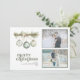 This romantic New Mr. & Mrs. photo card showcases not one but two favourite moments — wedding portraits, candid engagement shots, or cosy newlywed selfies — alongside hand-painted holiday details: pine sprigs, ribbon, and vintage-style ornaments in soft sage green. Finished with elegant typography, it’s a timeless way to share your joy with family and friends.