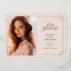Beautiful graduation photo announcement features a vertical or portrait orientated photo aligned at the left, with "our graduate" and your graduate's name, school, and graduation year to the right. Delicate geometric detailing in rose gold foil completes the look. Add a personal message to the back, along with an additional photo.