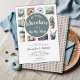 A vintage retro inspired co-ed baby boy shower invitation with a travel and adventure theme, featuring an illustration of travel stamps and other travel related images, in a vintage blue colour scheme, with the title "Our Greatest Adventure is on the Way". Perfect for future parents who love to travel, who love the adventure theme and retro and vintage designs.