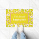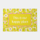 Bright and sunny throwback pattern features white flowers with pink and green centres on yellow background. Centre yellow text box with customisable "This is our happy place" text