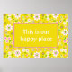 Bright and sunny throwback pattern features white flowers with pink and green centres on yellow background. Centre yellow text box with customisable "This is our happy place" text