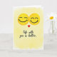 This greeting card shows two bright yellow emoji faces near the top, gently overlapping as if they’re leaning into each other. Both have closed eyes and soft smiles, giving them a calm, happy look. A small red heart sits between them, right where their faces meet, hinting at love and closeness ❤️. The background looks like a light watercolor wash in warm yellow that fades into white around the edges, keeping the focus on the couple. Near the bottom, the card says “life with you is better” in a flowing script style that feels personal and handwritten. The text is dark and easy to read, sitting centered below the emojis like a simple, heartfelt note 💌. Altogether it feels sweet and steady, like a quiet moment shared with someone you care about 🍫. Hope it helps you share your Valentine’s Day feelings with someone special.