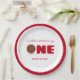 Our little meatball is turning one first baby birthday paper plates with a red border. They are white, red, and brown with the word "One" in large letters with a cute meatball illustration as the first letter of the word. Simply, customise these plates, add them to your cart, and happy birthday to your wonderful baby!