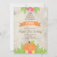 This cute first birthday party invitation features a bright coloured graphic of a pumpkin on a rustic background. The design is accented with a pink flowers to make it perfect of the girl.