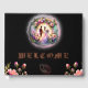 Unique Design wedding guestbook! The design has a lovely bride and groom couple standing under floral archway. There is a glowing moonlight in the background.
