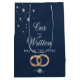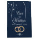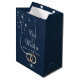 Celebrate eternal love with this stunning navy gift bag featuring shimmering silver stars, elegant script "Our Love Was Written in the Stars," and golden interlocking rings. Perfect for wedding favors, bridal showers, or anniversaries—elegant packaging for sweets, trinkets, or thank-you gifts!
