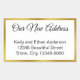 This gold and white moving announcement lets everyone know you have a new address. At the top, an elegant black script is available for your custom message. (Shown: Our New Address) There are three additional lines of display text for your name and new address. All text can be edited or deleted. The text is black. The faux gold border is not made of foil.