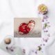 Elegant foil birth announcement featuring "Our New Love" displayed in a gold foil script overlay with rose gold foil hearts on each side. Personalise the gold foil birth announcement with a horizontal newborn photo, the baby's name, and birth stats. The announcement reverses to display 3 additional photos and text with a solid dark red background. The 4 photo birth announcement is perfect to use as a Valentine's day birth announcement!