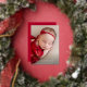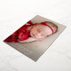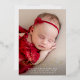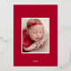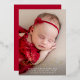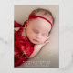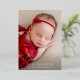 Elegant foil birth announcement featuring "Our New Love" displayed in a gold foil script overlay with gold foil hearts on each side. Personalise the gold foil foil birth announcement with a vertical newborn photo, the baby's name, birth stats, and welcomed by text. The announcement reverses to display an additional photo with a solid dark red background. The 2 photo birth announcement is perfect to use as a Valentine's day birth announcement!