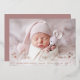 Elegant foil birth announcement featuring "Our New Love" displayed in a rose gold foil script overlay with rose gold foil hearts on each side. Personalise the rose foil birth announcement with a horizontal newborn photo, the baby's name, and birth stats. The announcement reverses to display 3 additional photos and text with a solid dark mauve background. The 4 photo birth announcement is perfect to use as a Valentine's day birth announcement!