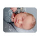 Elegant photo birth announcement magnet featuring "Our New Love" displayed in a white script overlay with hearts on each side. Personalise the simple birth announcement magnet with a vertical newborn photo, the baby's name and birth stats.