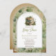 Embrace the beauty of a vintage-inspired design for your baby shower with the touching sentiment, 'Our Next Chapter Begins…'. This charming illustration features a carefully stacked collection of antique books, their spines worn with age, and delicate leaves gracefully intertwined around them. The books are set against a white, rounded-rectangle backdrop, subtly framed by an underlay of organic leaves and aged look faux kraft paper, creating a nostalgic and rustic atmosphere. This design evokes a sense of timelessness, perfect for celebrating the beginning of a new chapter in life.
