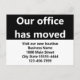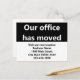 This black and white postcard sign says 'Our office has moved'. Use the white field to customise your postcard with your company's name, new address, and phone number.