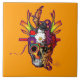 Contemporary Interpretive Southwestern iconic skull art of Día de los Muertos (Day Of The Dead) celebration by artist Margaret Loftin Whiting with skull, mask, flowers, bird and flowing ribbons. Digital collage poster art alive with bright colours of the Southwest.