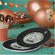 Fun astronaut themed birthday party design features a graphic of the Earths moon with a little astronaut all suited up in his space suit, standing on the surface of the moon and holding a flag in this hand. Off in the distance is the planet Earth, all against a deep, dark, black outer space background. Around the curve on the top portion of the moon is text in fun black font that says Happy Birthday. Below the astronaut on the lower half of the moon is a place to customise with the birthday boy or girls name in black font. This is the perfect design for your child's astronaut or space themed birthday party. Matching invitations, cups and napkins also available.