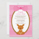 Adorable Outback Australian Baby Shower invitation featuring a cute momma kangaroo holding a baby kangaroo set on a stripe background. Matching items available in our shop. Perfect for a baby girl baby shower. ©Stockberry Studio