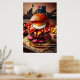 Conquer your hunger with this triumphant Outback Tucker Burger. A thick kangaroo beef patty, grilled to perfection, is topped with a fried egg, vibrant beetroot slices, crispy bacon, and a generous drizzle of smoky barbecue sauce, all nestled within a toasted damper roll. A small Australian flag adds a touch of Outback spirit, while a backdrop of the Sydney skyline completes this Australian culinary adventure.