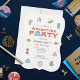 Celebrate the great outdoors with this kids' birthday party invitation design featuring camping and hiking graphic icons, including a map, mountains, tent, branch, compass, backpack, sleeping bag, lantern and trail signs. A lined woodgrain is featured in the background with red, blue, green, tan and grey illustrations. Easily customise the name and year. This would be the perfect party invitation for the camper, hiker, boy scout, girl scout, cub scout or outdoor enthusiast.