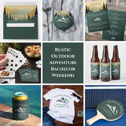 These outdoor adventure bachelor weekend napkins are the perfect accessory for a mountain-themed bachelor weekend. This design features a forest green background and has space for personalisation with "BACHELOR WEEKEND," the groom's name, and the event dates.