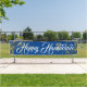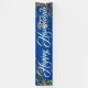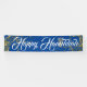 Select from indoor or outdoor, with or without grommets. Shown in Blue with White text "Happy Hanukkah" in a fancy script with two Gold looking swirls of stars on each end.