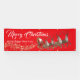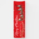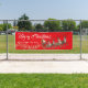 Select from indoor or outdoor, with or without grommets. Shown in red with white text "Merry Christmas" and "Happy New Year" in a fancy script and coordinating text with Santa and his reindeers. A wind of stars images rails the sleigh.