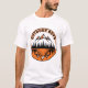Minimalist mountain and forest logo with a lake reflection, bold text "OUTDOOR BOYS" curved around the circle, orange and black colour palette, modern adventure T-shirt design.
