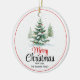 Outdoors Christmas tree Merry Christmas ornament. This outdoor Christmas tree design captures the essence of the holiday season with a beautiful winter landscape, showcasing snow-laden trees decorated in vibrant colours. The bold "Merry Christmas" message is eye-catching, complemented by delicate grey snowflakes drifting in the background, enhancing the enchanting winter atmosphere. There is a red thin border around it. The back features a family photo.