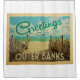 This Greetings From Outer Banks vintage postcard design features a sandy beach with a beautiful turquoise ocean water and above the sea, a blue sky with billowy white clouds. In vintage travels style.