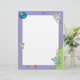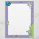 This cute letterhead features a blue border with planets, the Earth, satellites, and an astronaut tethered to a lunar module on the moon.