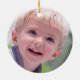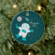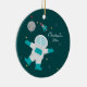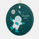 This cute boy's personalised round ceramic photo ornament has an out of this world space theme! The background has a dark teal colour with lots of yellow, white, and grey stars in the background. There is an astronaut on the bottom with a grey moon with a star flag at the top. There is a rocket ship floating to the right of the moon. On the right, you can easily customise the name and the year. On the backside, you can easily add your own photograph.