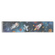 Featuring illustrations of outer space activities and icons as stars, a space rocket, an astronaut, moon, satellite, and other planet system elements