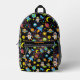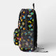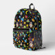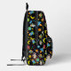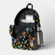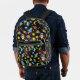 A fun colourful Outer space backpack Design features fun cartoon astronauts, rockets, aliens. stars, moon and planets all on a black milky-way photographic background. Personalise by amending the child's name ( in an orange coloured font. Great to give as a gift for birthdays or back to school backpack.