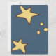 This fun, outer space theme party invitation features a dark blue background with accents of space clouds and stars. A large image of a cute, illustrated astronaut or cosmonaut is pictured on the right with a sample child's photo placed inside the helmet. You can include your own photo to appear behind the visor. The astronaut is pictured with planet Earth in the distance, and a rocket ship blasting off from it. A moon and shooting star are seen in the distance.