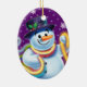 Oval shape purple Christmas tree decoration Snowman and tinsel. Purples.