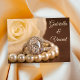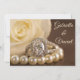 Invite guests to your upcoming nuptials with the elegant Oval Diamond Ring and White Rose Wedding Invitation. Personalise it with the names of the bride and groom and specific marriage ceremony details. This classy custom botanical wedding invite features a close up floral photograph of an oval diamond engagement ring, white pearl necklace and white rose flower blossom on a brown silk background.