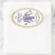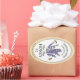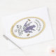 Lavender Flowers and honeybees on white background with dashed lavender-coloured oval. Perimeter of label is edged with yellow. Fits one-and-two pound Classic and Traditional Queenline Glass Honey Jars. A smaller matching sticker is available on waterproof vinyl for 8 oz Queenline Glass Jars.