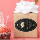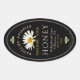 Black oval honey sticker with daisy photo and vintage honeybees at top and bottom of label. "Honey" is printed in a decorative font. "Product of USA" is indicated at bottom of label. Name of apiary is written in curved font above daisy.