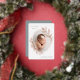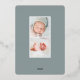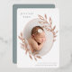 Elegant birth announcement features a single vertical/portrait orientated photo in an oval shape, adorned with delicate rose gold foil laurel leaves. Personalise with your baby's name, birth date, stats, and a family signature. Add two additional square photos to the back.