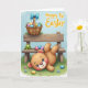 At the center of the card is a round-faced, bunny-like creature with soft brown fur, lying on its back near the bottom of the scene with curled paws, big blue eyes, and rosy cheeks that read like a shy, affectionate blush 🐰. Behind it, a rustic wooden bench supports a woven basket tied with a periwinkle-blue bow, and the two seem paired like friendly companions in the same little spring moment. The basket overflows with pastel oval eggs in pink, blue, yellow, and purple, each decorated with small patterns that add a gentle, festive rhythm. A small bright-green frog with curious eyes sits on the bench as if keeping watch, adding a quiet hint of friendship to the setting. The foreground is grassy and dewy with tiny wildflowers and a few scattered eggs, suggesting recent exploring and shared discoveries 🐇. In the upper right, the text reads “Happy 1st Easter” in a clear, dark-colored font that stands out against the pale sky. Soft light washes the scene from above, turning the sky a calm, powdery blue and leaving the bench’s wood grain and the basket’s weave lightly detailed. The periwinkle bow loops neatly over the basket rim, with one ribbon tail draping toward the eggs.