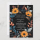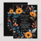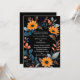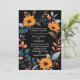 This wedding card design features an elegant, oval floral frame centred on a deep black background. The frame is composed of vibrant orange sunflowers, complemented by an array of blue, grey, and peach-coloured leaves and sprigs, creating a harmonious blend of warm and cool tones. The arrangement of flowers and foliage forms a natural border around the card, making it perfect for showcasing the wedding details in the centre. The design combines modern sophistication with a touch of rustic charm, making it an ideal choice for a wedding that embraces both elegance and the beauty of nature. Personalise the card with your names and details of the wedding. You can download the card to your mobile device or computer. Card was created with the help of ai.